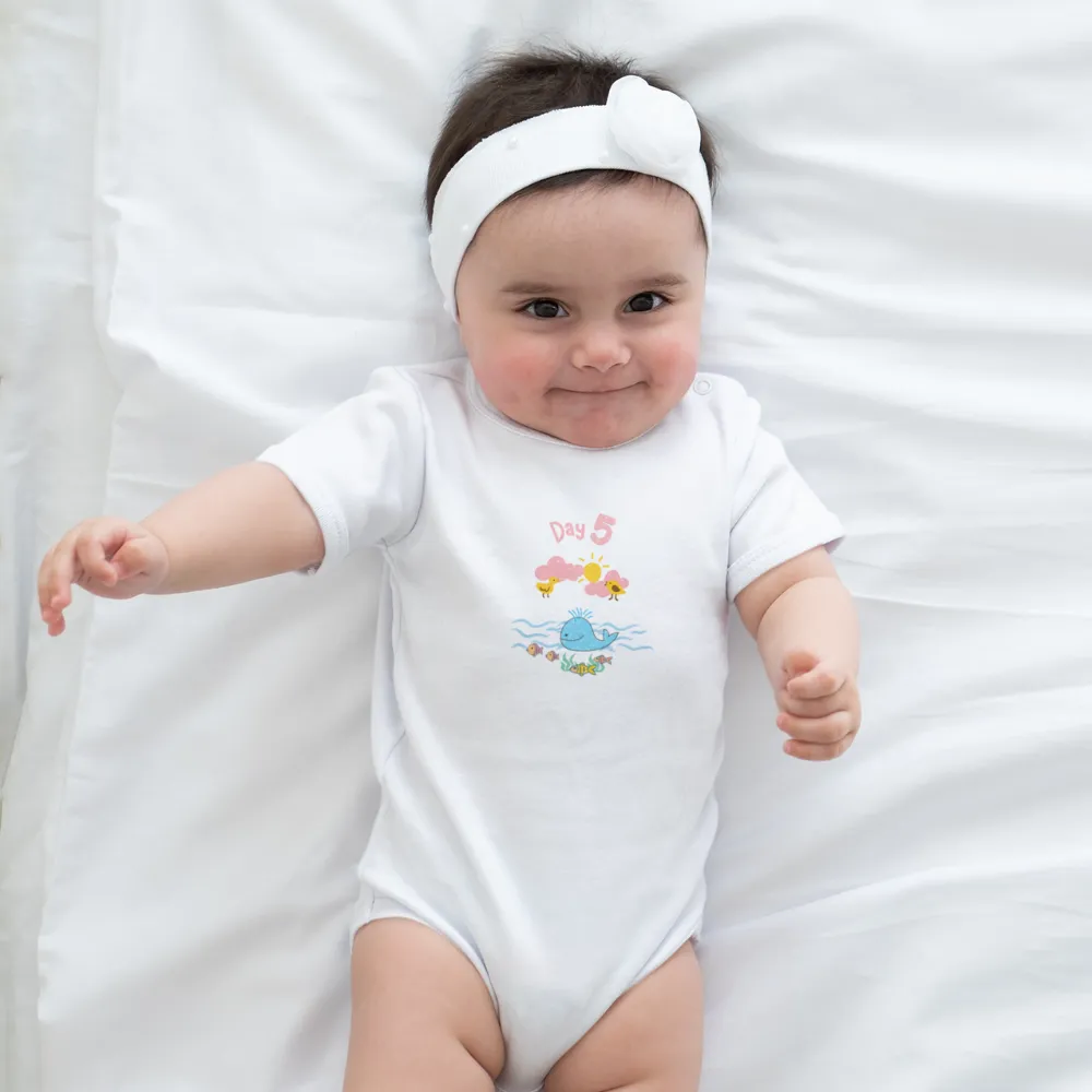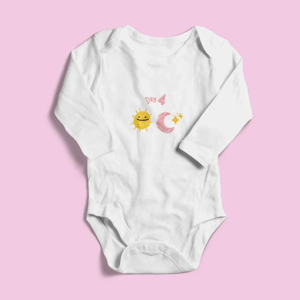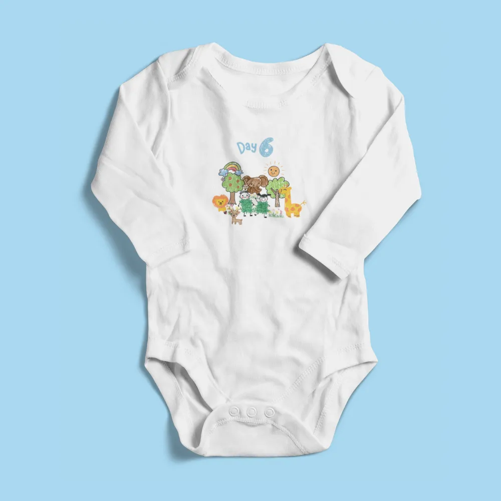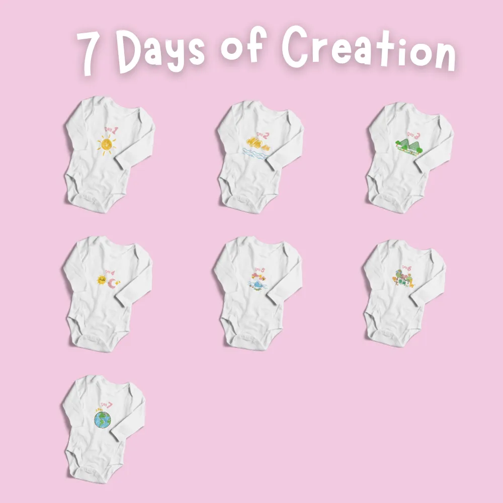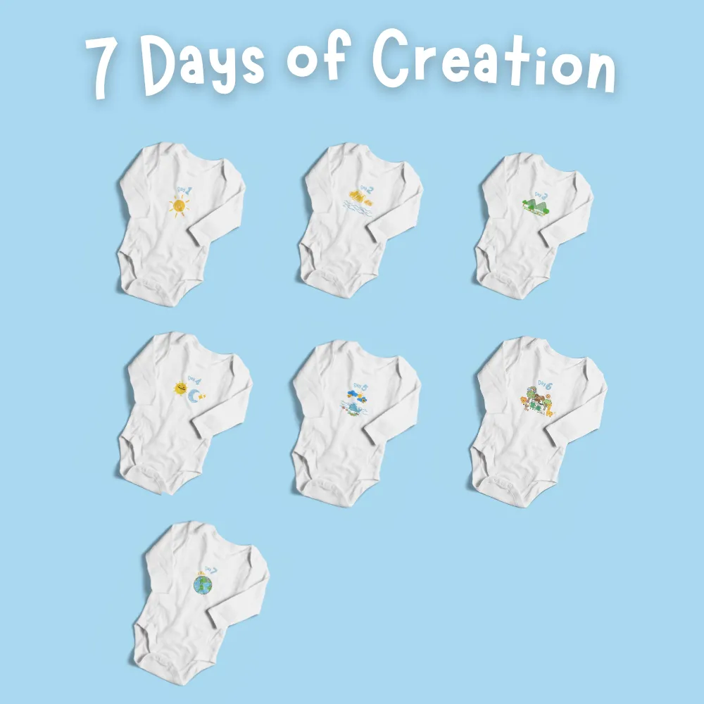 Celebrate God’s wonderful creation every day of the week with this beautifully designed set of 7 baby bodysuits, each inspired by one of the seven days of Creation in Genesis. Perfect for newborns, this unique set wraps your little blessing in comfort, love, and the story of God’s handiwork.